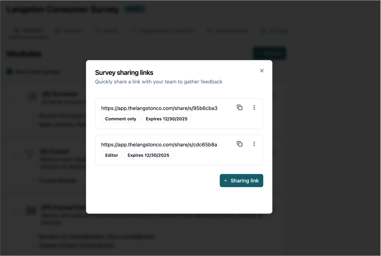 Langston’s structured approach to research using our research modules means that every survey comes with a ready-to-use template with the question types and module order already optimized for analysis. This makes your survey development as paint-by-numbers as possible. The survey itself is already structured in a way to deliver strategic thinking so you can focus on adding your expertise and choosing what content and inputs get included in each module.