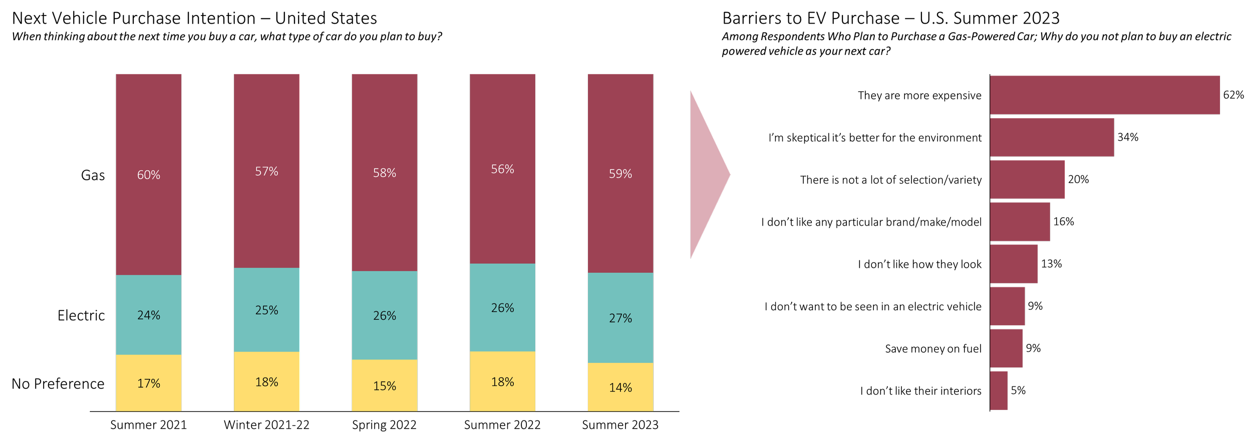 Although there has been a slight improvement in the percent of consumers in the United States who plan to next purchase an electric vehicle, growing from 24% in the summer of 2021 to 27% in the summer of 2023, this is the result of shifting consumers with no preference to preferring an electric car. Those who planned to purchase a gas-powered car as their next vehicle cited price barriers first when asked why they do not plan to purchase an electric-vehicle instead, followed by skepticism towards the environmental benefits and a long tail of additional reasons. While a number of premium EV brands have entered the market in recent years, this could be an indication that there is an opportunity for a lower-cost brand to shift consumer perception and grow the market.